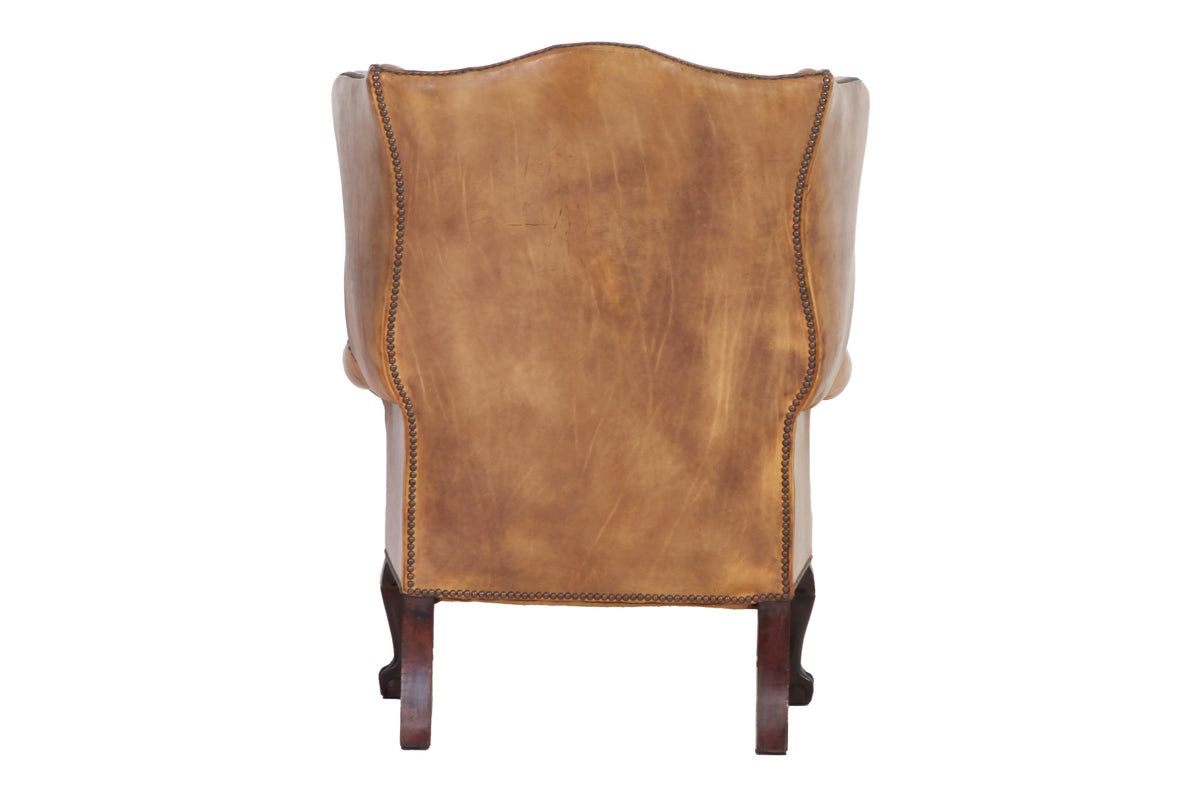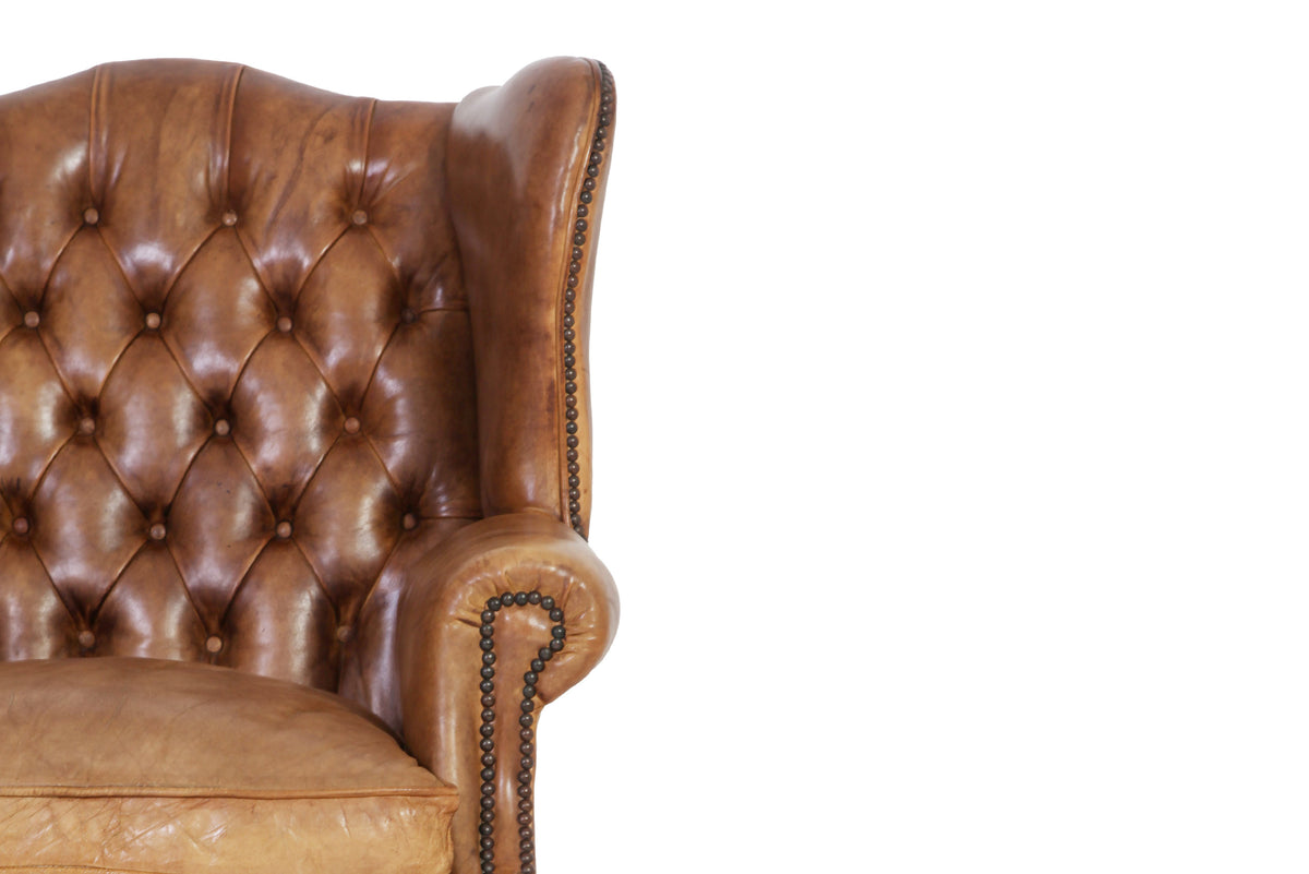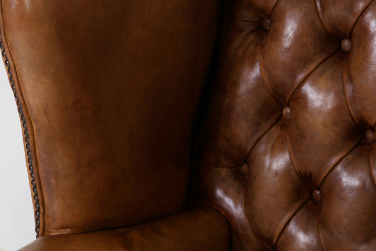 Antica coppia di poltrone chesterfield Wing Back o bergere inglese originale in pelle tabacco