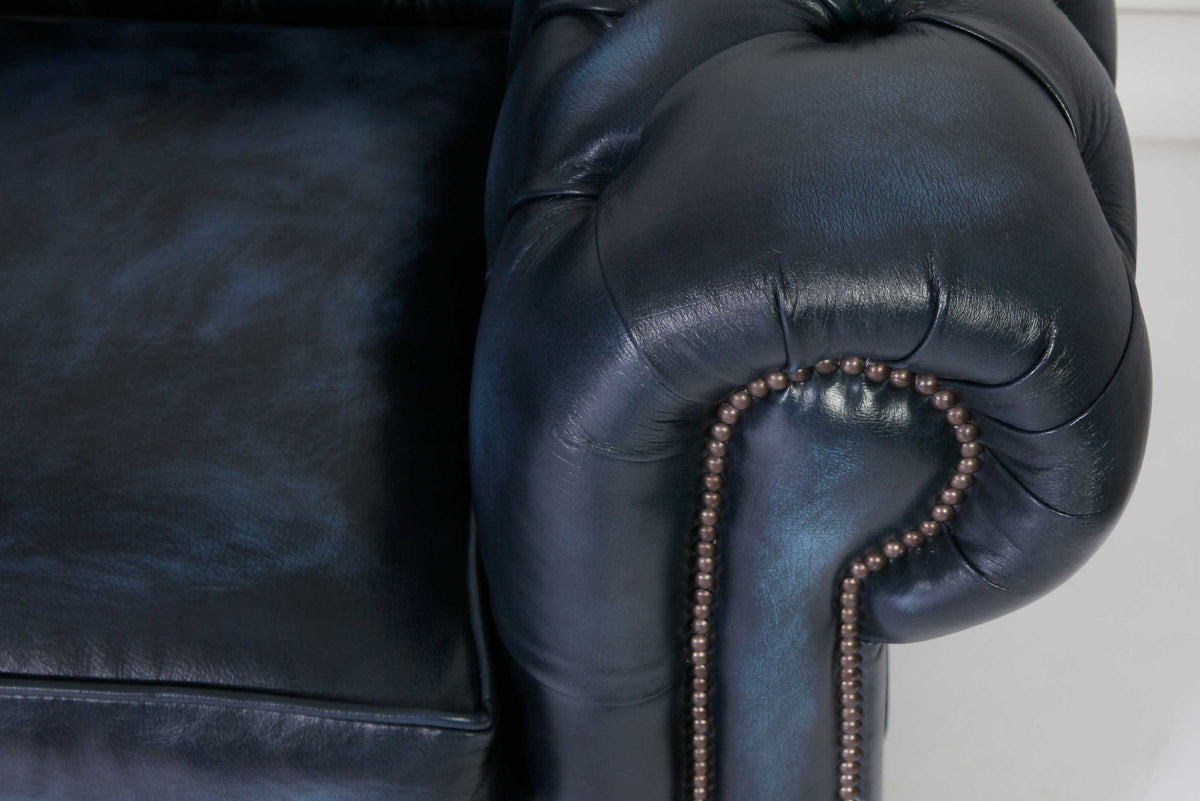 Divano chesterfield modello club inglese originale interamente rivestito in morbida pelle bovina di pieno fiore blu petrolio. La pelle tamponata...