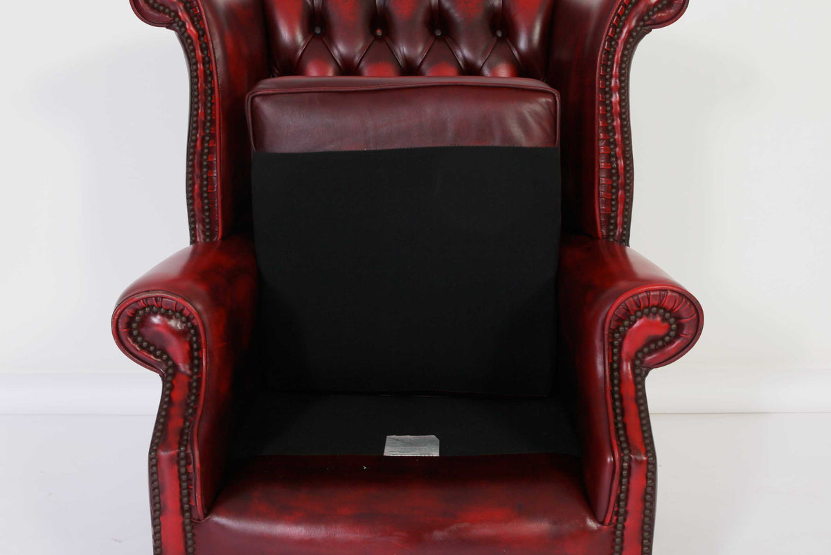 Iconica poltrona chesterfield modello Queen Anne inglese originale dalle vivaci tonalità rosso bordeaux stonalizzate a mano. Realizzata nel 1995 in...
