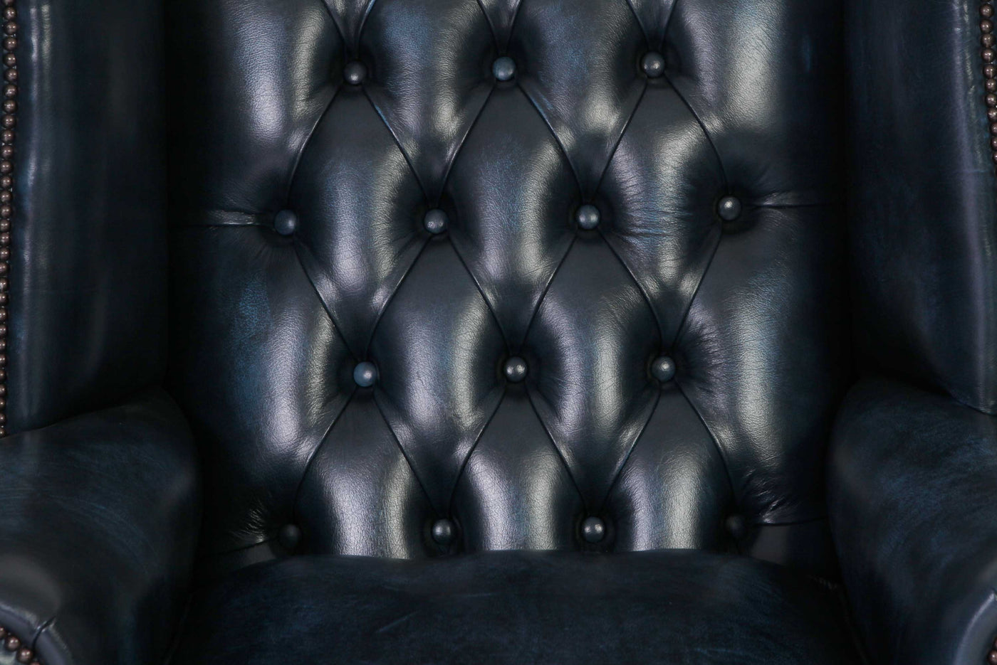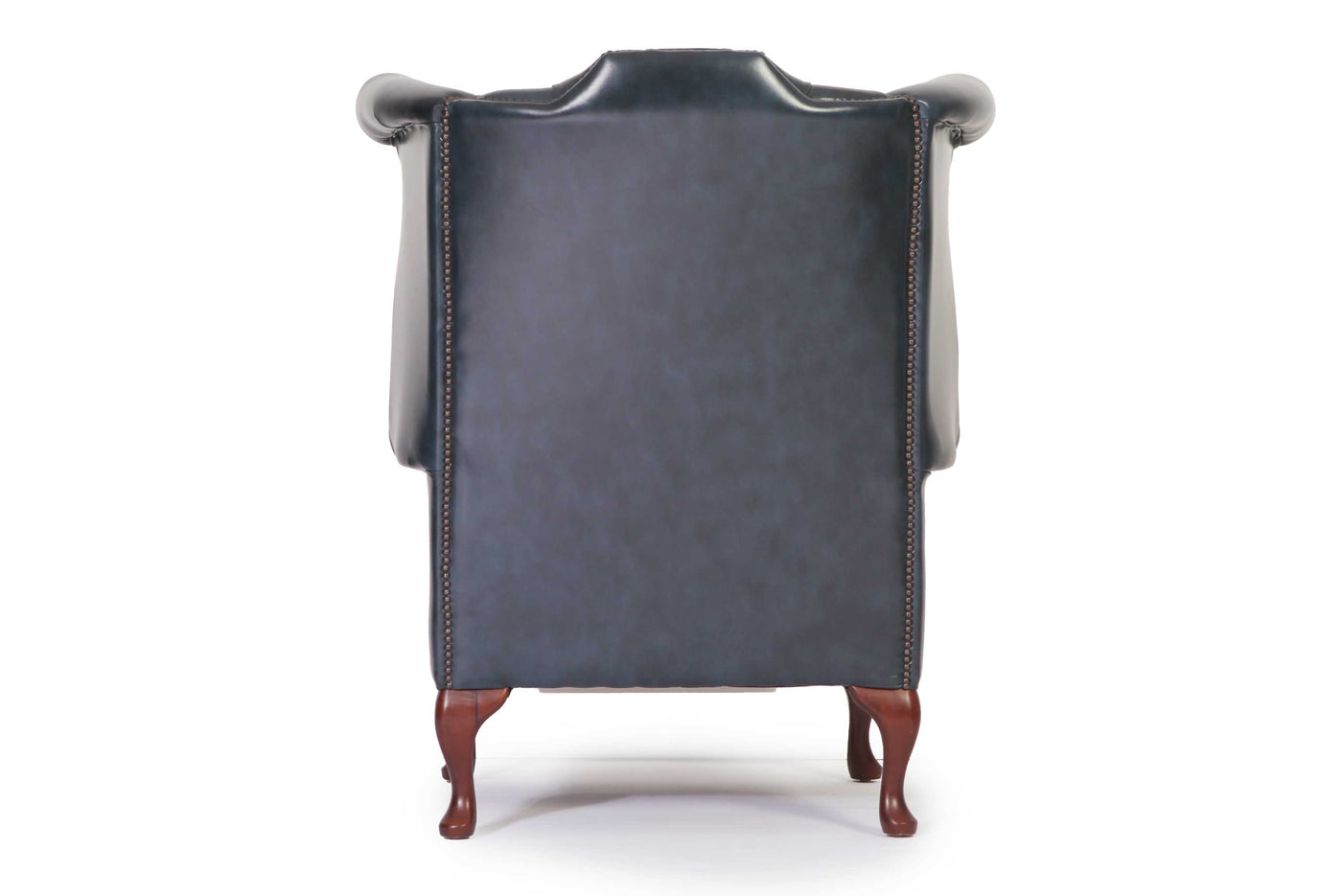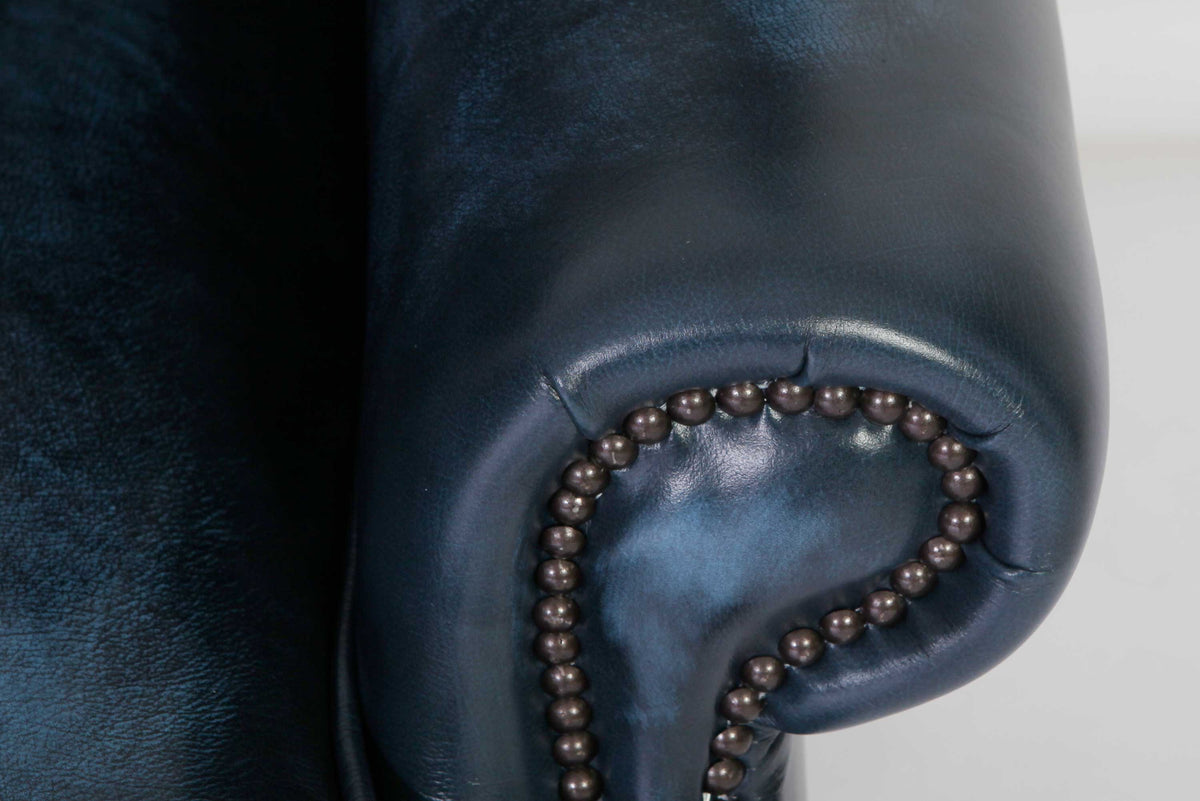 Elegante poltrona chesterfield modello Queen Anne realizzata artigianalmente in Inghilterra attraverso l' utilizzo di pelle bovina di pieno fiore blu...