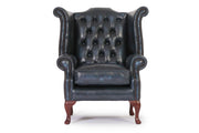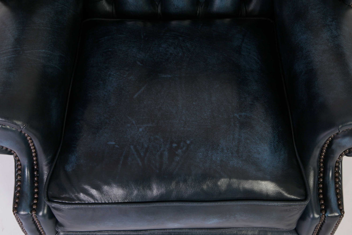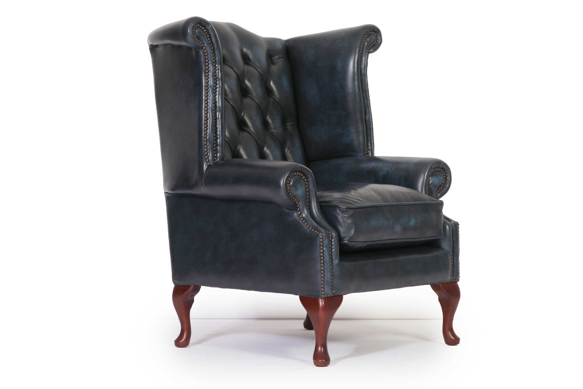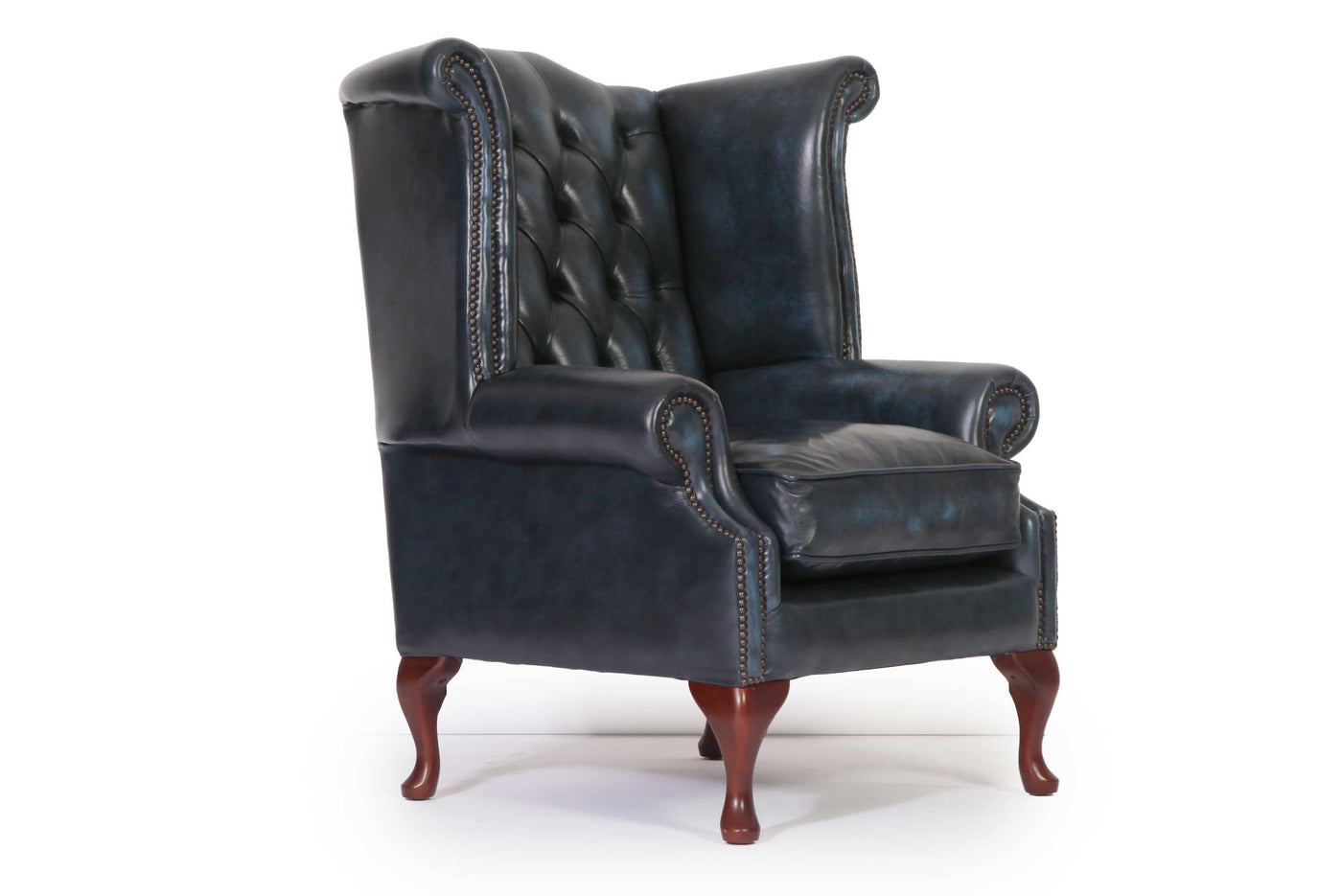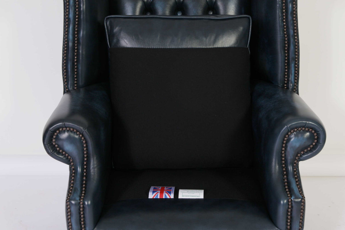 Elegante poltrona chesterfield modello Queen Anne realizzata artigianalmente in Inghilterra attraverso l' utilizzo di pelle bovina di pieno fiore blu...